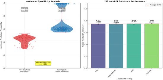 Model bias assessment across substrate types. (A) Model specificity analysis showing prediction score distributions for true negative enzymes (non-plastic degraders, ) versus training data plastic degraders (). Mann–Whitney U test confirms significant discrimination (). (B) Cross-validation performance on non-PET substrates demonstrating balanced accuracy across substrate families. Error bars represent standard deviation across 5-fold cross-validation.