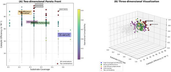 Top-ranked combinations were identified through composite scoring integrating all three objectives. The highest-performing combination (Protease + Glucosidase) achieved substrate coverage of 0.67, catalytic efficiency of 96.8 , and operational compatibility of 0.85, representing optimal balance across objectives. Notably, Protease appeared in multiple top combinations (Protease + Glucosidase, Lyase + Protease, Hydrolase + Protease), suggesting its role as a versatile partner enzyme with broad complementarity potential. The optimization successfully identified combinations spanning the complete performance spectrum, providing stakeholders with application-specific enzyme cocktail recommendations ranging from specialized high-efficiency systems to broad-spectrum degradation platforms.