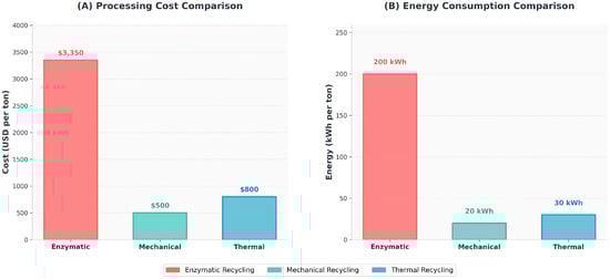 Economic and environmental impact comparison of plastic recycling technologies. (A) Processing costs show enzymatic recycling at $3350 per ton versus $500 and $800 per ton for mechanical and thermal recycling, respectively. (B) Energy consumption comparison reveals that enzymatic processes require 200 kWh per ton compared to 20–30 kWh per ton for conventional methods.