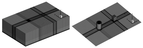 where the overlines of “” and “” denote the filtered variables of LES; the subscripts of i and j can be set as 1~3 to represent the three cartesian coordinate directions, respectively. In Equations (1) and (2), , , and can be calculated by