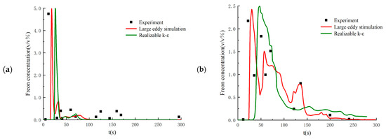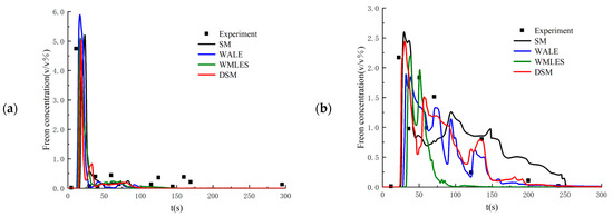 Time histories of Freon concentrations at the monitored points computed from different SGS models: (a) windward side point of the obstacle; (b) leeside point of the obstacle.