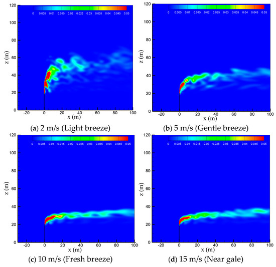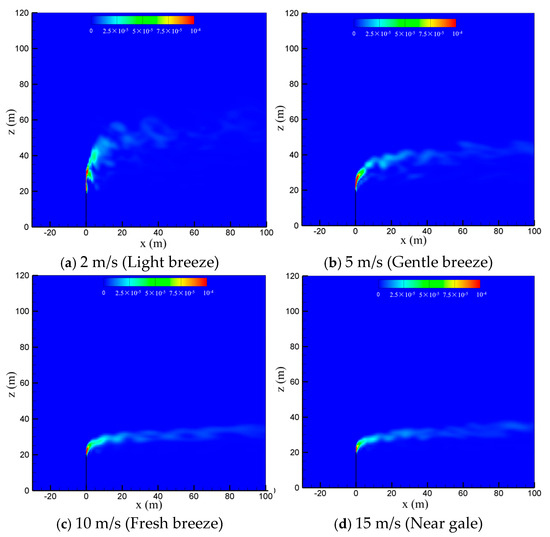 To study the effect of natural wind on the diffusion of vented sulfur-bearing natural gas, four wind speeds of 2 m/s, 5 m/s, 10 m/s and 15 m/s are considered, which correspond to the light breeze, gentle breeze, fresh breeze and near gale wind scales, respectively, with the sulfur content and the venting rate of natural gas fixed at 200 ppm and 200 m/s. Figure 6 presents the methane concentration contour maps in the x-z-plane at four wind speeds. As seen in the figure, the convective effect of the wind is enhanced as the wind speed increases, and thus the high-concentration methane zone is gradually reduced and deflected to the flow direction. In addition, strong wind can suppress the turbulent pulsation of the jet. As a result, the diffusion path of the gas becomes regular and extends to a farther distance at larger wind speeds. Figure 7 shows the concentration contour of hydrogen sulfide. As seen in the figure, the diffusion of hydrogen sulfide exhibits a similar trend with methane as the wind speed is increased. The shrinking of the diffusion area of the vented gas at high wind speeds could be understood by comparing the momentums of the vented gas and the wind. Considering that the discharge velocity at the outlet of the venting pipe is as high as 200 m/s, the convection effect dominates the cold-vented processes. At a small wind speed, the vented gas has a much larger momentum than that of the wind, and thus the vented gas flow is able to “penetrate” the air flow, resulting in a large vertical convection distance of up to 30 m at 2 m/s. As the wind speed increases, the ratio between the momentum of the vented gas flow and wind flow drops, and the vertical transportation distances of CH4 and H2S decrease below 10 m at 15 m/s.