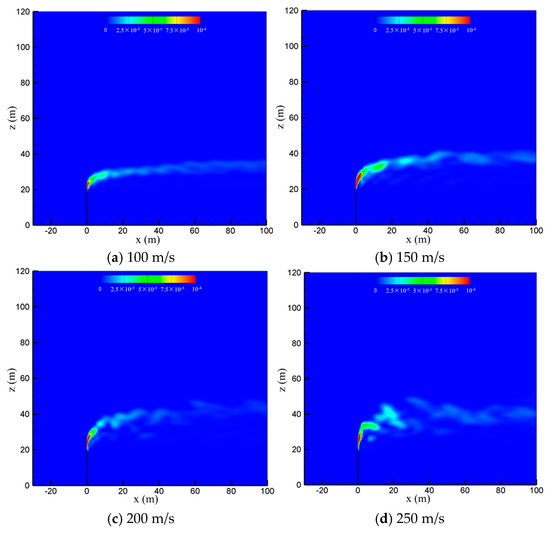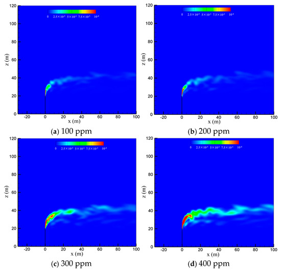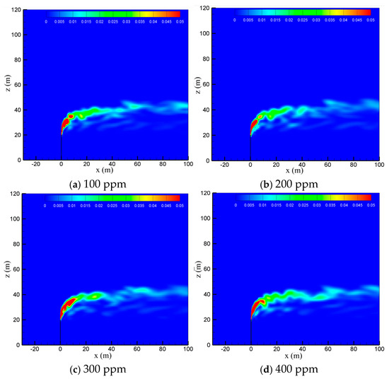 To examine the effect of sulfur content, the diffusion process of the cold-vented natural gas at hydrogen sulfide concentrations of 100 ppm, 200 ppm, 300 ppm and 400 ppm is studied, with the ambient wind speed fixed at 5 m/s and the gas venting rate fixed at 200 m/s. As seen in Figure 8, varying the content of hydrogen sulfide in the 100 ppm~400 ppm range shows little effect on the diffusion and convection process of methane. Figure 9 shows the hydrogen sulfide concentrations at different sulfur concentrations. In order to clearly show the area with poisoning risk, the maximum value of the contour in Figure 9 is set as 100 ppm, which can threaten human life and health. As seen in the figure, as expected, the diffusion area of hydrogen sulfide amplifies significantly as the sulfur content increases. Moreover, at the wind speed of 5 m/s, the region with a concentration of hydrogen sulfide higher than 100 ppm is always above the vent pipe outlet, and an accumulation of hydrogen sulfide near the ground wall is not observed.