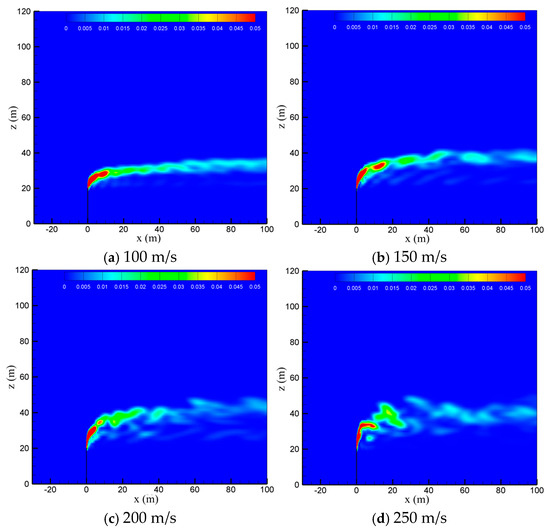 The venting rate of the vent pipe is decided by the pressure equipment and working conditions. The cold-vented processes at four venting rates of 100 m/s, 150 m/s, 200 m/s and 250 m/s are concerned with the sulfur content fixed at 200 ppm and wind speed fixed at 5 m/s. As seen in Figure 10, the venting rate increases, the diffusion height of CH4 along the vertical direction increases, while the downwind skew angle decreases due to the increase in the momentum ratio between the vented gas flow and wind flow. At smaller venting rates of 100 m/s and 150 m/s, the effect of wind speed is significant, and the released CH4 mainly spreads along a regular path in the horizontal direction. At larger venting rates of 200 m/s and 250 m/s, however, the gas jet from the pipe outlet becomes very turbulent, and the effect of wind speed is weakened. As a result, the diffusion area of methane is broadened and becomes more irregular, which is helpful for the diffusion of CH4. As seen in Figure 11, the influence of the venting rate on the diffusion of H2S is similar to that of CH4. As the venting rate increases, both the height and area of the high-concentration region of H2S increase, while the deflection angle and stability of the gas cloud decrease. Therefore, a larger venting rate is able to promote the diffusion of the vented gas by increasing the vertical transportation distance and making the vented gas cloud more turbulent.