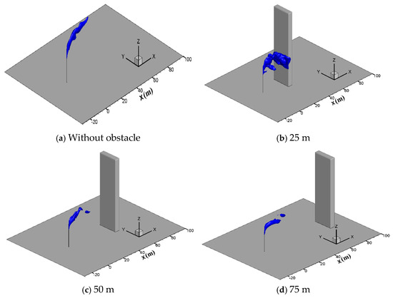 In engineering applications, there are usually obstacles such as station buildings, mountains and trees in the surrounding of the vent pipe, which may affect the diffusion process. To study the effect of tall buildings, gas diffusion processes with a hexahedron obstacle (10 m × 5 m × 80 m) located at 25 m, 50 m and 75 m downstream of the venting pipe are simulated at the wind speed of 5 m/s, a sulfur concentration of 200 ppm and a venting rate of 150 m/s. Figure 12 presents the three-dimensional iso-surfaces of the methane concentration of 2.5% in different cases. As seen in the figure, when the obstacle is located 25 m downstream of the vent pipe, methane gathers on the windward side of the obstacle and spreads down to the ground along the obstacle, increasing the concentration of methane gas near the ground and the risk of combustion and explosion. When the distance increases to 50 m and 75 m, the concentration of methane greatly reduces when it spreads to the obstacle, and thus the risk of accumulation and ignition on the ground no longer exists.
