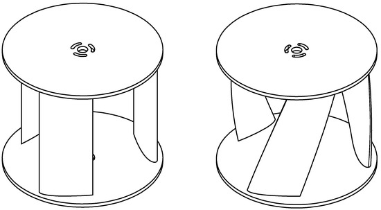 The Gorlov turbine is essentially a Darrieus turbine with a key alteration: the replacement of straight blades by helical ones [26], as shown in Figure 1. The helical blade design enhances torque characteristics, thereby improving the turbine power coefficient (). This turbine was developed in 1995 by Professor Alexander M. Gorlov [27,28]. He analyzed a three-bladed helical turbine configuration with a diameter of 0.6096 m and a height of 0.8636 m, and he incorporated a NACA 0020 airfoil with a chord length of 0.1778 m for the blades. The turbine’s overall efficiency reached 35% in a flow of 1.524 m/s.