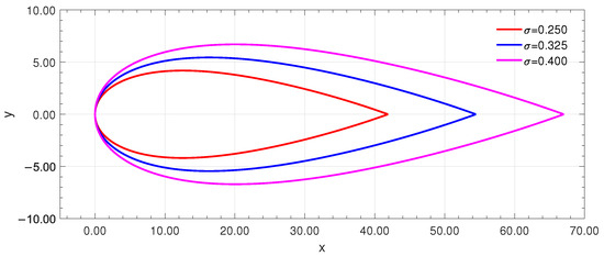 A higher increases the proportion of the rotor covered by blades, enhancing energy capture but also increasing drag and flow resistance, which can reduce efficiency. This configuration is suitable for low-velocity flows where maximizing energy extraction is essential [43,44,45]. Conversely, a lower reduces resistance and turbulence losses, improving efficiency but potentially limiting energy capture, particularly in slow-flowing rivers. For VAHTs, typical values range between 0.2 and 0.4, balancing efficiency and energy extraction [45,46,47]. In low-velocity river conditions, higher values may be preferable to optimize power output while minimizing hydrodynamic resistance. The choice of value must be carefully coordinated with other design parameters, such as blade count and rotor diameter, to achieve an optimal balance between performance and efficiency. Figure 3 shows how the NACA 0020 airfoil’s blade profiles change at levels of 0.25, 0.325, and 0.4. All dimensions are in mm. The resulting chord lengths for these solidity values are 41.88 mm, 54.45 mm, and 67.02 mm, respectively.