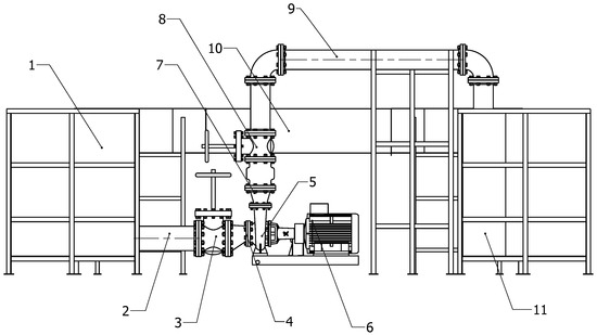 Test bench: (1) Suction tank, (2) Suction line, (3) Valve, (4) Eccentric reducer, (5) Pump, (6) Motor, (7) Concentric reducer, (8) Valve, (9) Discharge line, (10) Test section, (11) Discharge tank [25].