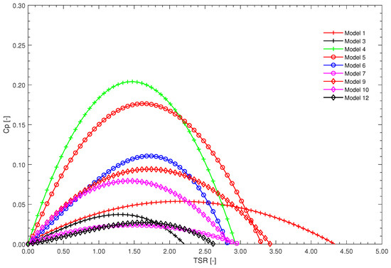 As shown in Figure 10, all curves exhibit a characteristic trend typical of vertical-axis turbines. Three distinct regions can be identified: I. Growth phase: initially increases with , indicating improved energy capture efficiency. II. Peak: Each curve reaches a maximum at a , representing the optimal operating point for each turbine model. III. Decline: Beyond this peak, decreases as the continues to rise, due to increased losses and flow separation [79,80,81,82].