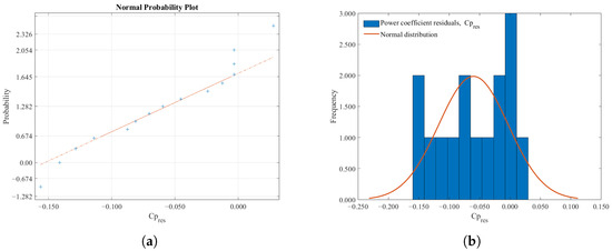 In regression modeling, verifying the normality assumption of residuals is crucial for the validity of the analysis [92,93,94]. This requirement was initially assessed visually by examining the frequency distribution (Figure 11a), where histogram bars should match the normality line (red). Subsequently, the normal probability plot was inspected (Figure 11b), with data points expected to closely track the red line, indicating normally distributed residuals. These graphical evaluations were further supported with numerical tests (Table 5). As all p-values in the table were above 0.05, the residuals indeed follow a normal distribution.