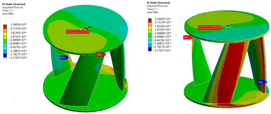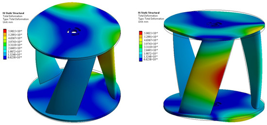 Figure 14 shows the pressure field on one of the studied models, obtained from the fluid dynamics simulation. In the figure, the red color indicates areas of higher pressure, while the blue color corresponds to regions of lower pressure. These pressure distributions obtained from the CFD analysis are then mapped onto the CAD model to serve as input for a structural analysis within an FSI framework. This process allows for the evaluation of the mechanical response of the turbine components under realistic operating conditions, ensuring that the design can withstand the loads imposed by the fluid flow. Figure 15 shows the maximum and minimum deformations for model 4, which are caused by the fluid pressure distribution illustrated in Figure 14. This procedure was repeated for the 15 models analyzed, and the resulting maximum deformations are presented in Table 6. Since the pressure field varies across each model due to differences in geometry and flow interaction, the resulting deformations also differ accordingly. It is important to note that the deformation displayed in Figure 15 is scaled to enhance visualization; in fact, the rotor does not deform to the extent shown in the figure. Specifically, the deformation is magnified by a scale factor of . Additionally, Table 6 includes the volume of each model.