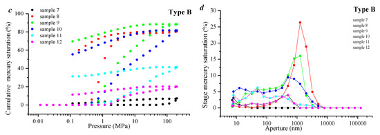 - Based on the mercury-in and mercury-out curves, the samples can be divided into two categories, A and B. There is a significant hysteresis loop in the mercury inlet and outlet curves of type A, and the efficiency of the mercury inlet and outlet in pores is relatively high. Then, the pore volume is 0.785 to1.44 cm3/g, the average value is 1.039 cm3/g and the mercury removal rate is 32%~43%. The mercury removal curve of type B is almost parallel, and its mercury removal efficiency is relatively low. The pore volume of this type of sample is 0.191~0.844 cm3/g, the average value is 0.439 cm3/g, and the mercury removal rate is 31%~39%.