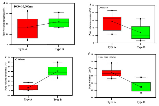 There are significant differences in the volume distribution of the pore structures between the different types (Figure 2). The pores of type A (<100 nm) are not well-developed, with a pore percentage of 0.91–17.29% and an average of 5.91%, which is much lower than the pore percentage of type B (<100 nm) (3.40–59.78%, with an average of 33.4%). But the pore volume percentage of type A (>100 nm) is much higher than that of type B (>100 nm). Therefore, the type A samples have more developed pores.