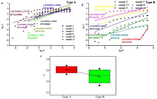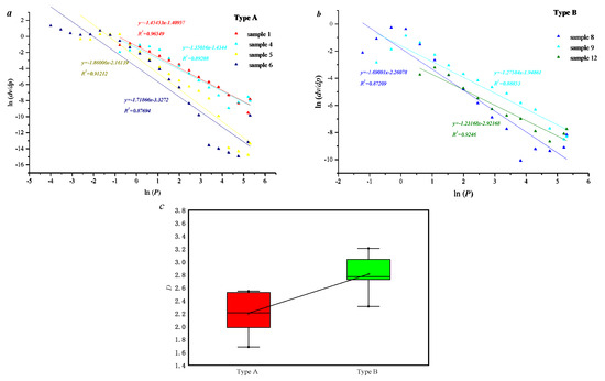 The typing features of the selected samples can be quantitatively described based on the sponge model (Figure 3). The curves of each sample in the figure are close to a straight line. This indicates that the sponge model can be used for the quantitative description of unconventional tight sandstone reservoirs. The fractal dimension of type A ranges from 1.68 to 2.54, with an average of 2.19, and the fractal dimension of type B ranges from 2.30 to 2.76, with an average of 2.60. This indicates the heterogeneity of the pore distribution in the type B samples is higher than that in type A. This is due to the relative development of pores smaller than 100 nm in the type B samples, resulting in significant differences in the pore volume distribution between the 0 and 10,000 nm samples.
