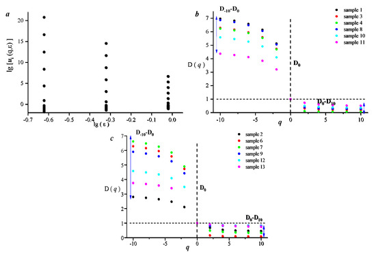 Based on multifractal theory, the multifractal characteristics of all the samples were described. There is a clear linear relationship between lg (e) and lg (ui (q,ε)) in Figure 5a, indicating that the high-pressure mercury injection curve of the sample has good multifractal characteristics. The multifractal curve of type A shows a clear inverse S-shape, with D−10–D0 ranging from 3.36 to 5.97, with an average of 5.05, and D0-D10 ranging from 0.49 to 0.94, with an average of 0.72; D−10–D10 ranges from 3.86 to 6.68, with an average of 5.77 (Figure 5b). The multifractal curve of type B also shows a clear inverse S-shape, but the dispersion of D−10–D0 and D0–D10 is large, that is, the D−10–D10 of this type of sample is 3.00–6.28, with an average value of 4.87; D0–D10 ranges from 0.18 to 0.92, with an average of 0.45 (Figure 5c).