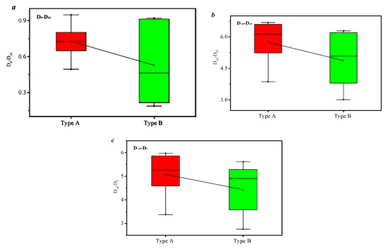 Multifractal dimension characteristics of the pore distribution of the type A and B samples ((a), D0-D10 for the low-value areas of the multifractal dimension of the sample; (b), D−10-D0 for the high-value region of the multifractal dimension of the sample; and (c), D−10–D10 for multifractal dimension distribution of the samples).