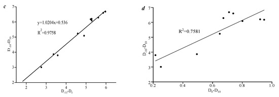 At the same time, the correlation between the pore volume and the multifractal parameters of the pore volume was studied. As the pore volume increased, the multifractal parameters of pore volume with different pore sizes increased to varying degrees. This indicates a strong correlation between the pore volume and the multifractal parameters. Unlike Figure 9a,b,d indicate that there is no significant correlation between the multifractal parameters and the stage pore volume. This is due to the strong heterogeneity of the pore volume distribution in each stage of the sample.