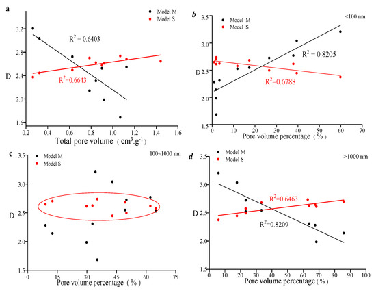 The size of the pores affects the correlation between the pore volume and the multifractal parameters. As shown in Figure 8a, when the total pore volume increases, the pore distribution coefficient represented by the S model is higher, while the pore distribution coefficient of the M model is lower. Combined with the pore volume distribution curve, it can be concluded that the non-uniformity of the pore distribution in type B is much higher than that in type A. Therefore, it is believed that the sponge model can better characterize the heterogeneity of the pore distribution in tight sandstone. As the pore volume (<100 nm) increases, the pore distribution coefficient characterized by the S model is lower, while the pore distribution coefficient of the M model is higher (Figure 8b), which is opposite to the results in Figure 8a. This indicates that the pore volume (<100 nm) has distinct pore volume distribution characteristics compared to the other pore size ranges. Figure 8c,d indicate a weak correlation between the pore volume and the pore size in the range of 100~1000 nm, suggesting that these pores are not the main factor affecting the overall heterogeneity of the pore distribution.