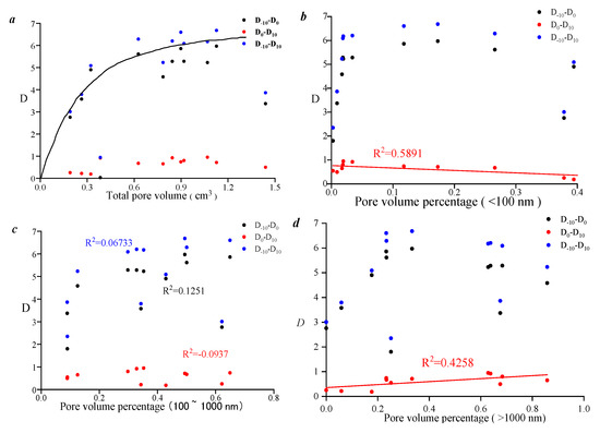 Correlation analysis between the singleplex fractal dimension based on the pore volume for different pore size ranges and pore volume percentages. (a) Correlation between sample total pore volume and singleplex dimension fractal model; (b) Correlation between samples with pore size < 100 nm and single-dimension fractal models; (c) Correlation between samples with pore sizes of 100~1000 nm and single-dimension fractal models; (d) Correlation between samples with pore sizes > 1000 nm and single-dimension fractal models.