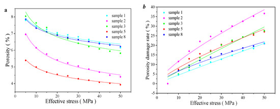Figure 10 shows the typical sample pressure pore permeability testing. As the effective stress gradually increases, the porosity of each sample decreases exponentially. Figure 10a shows that the initial porosity of each type is 5.39–8.04%, with an average of 7.20%. When the effective stress is 50 MPa, the porosity of each sample is 3.93–6.21%, with an average of 5.30%. To achieve quantitative characterization of the porosity changes, the parameter of the porosity damage rate is introduced to represent the trend of the porosity changes.