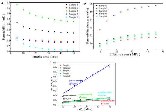 As the effective pressure increases, the porosity damage rate increases exponentially (Figure 10b). Meanwhile, the changes in permeability under different pressures were also analyzed. As the effective pressure increases, the permeability also decreases exponentially. In addition, the permeability damage coefficient was introduced to quantitatively characterize the changes in the permeability damage of the pores.