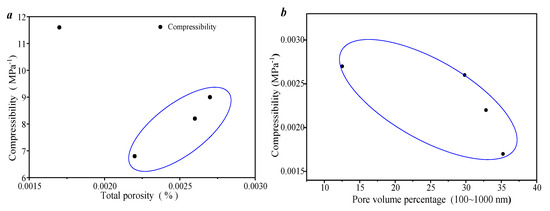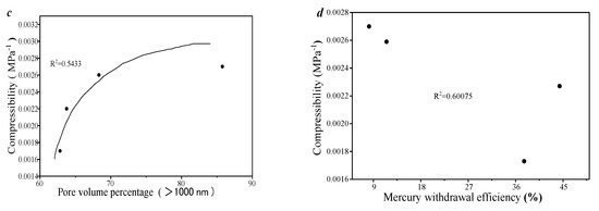 The compressibility of this type of sample was calculated. The compressibility of this type of sample is 0.002 to 0.015 MPa−1. Compared with the other literature, it can be seen that the pores of this type of sample have stronger sensitivity (Figure 11c).