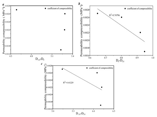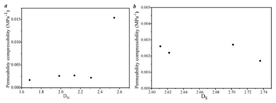 Correlation analysis between the porosity compressibility of the porosity and the single fractal of the pores. (a) the correlation between the singlet fractal dimension and the porosity compressibility coefficient based on the sponge model; (b) The correlation between the single-fold fractal dimension and the porosity compressibility coefficient based on the S-model. Figure 14 shows the relationship between the single fractal parameters and the permeability compression. As the fractal dimension value DM increases, the permeability compression of each sample gradually increases. This is because the fractal parameter mainly characterizes the increased heterogeneity of the pore distribution in small pores, which also means that larger pores have less heterogeneity and can provide more compression space and compression capacity for pores.