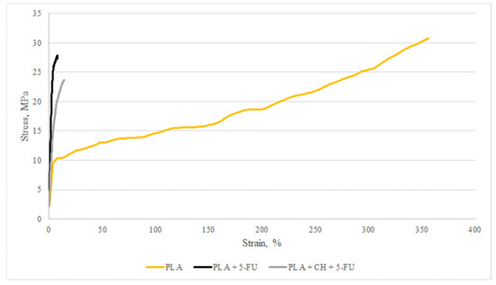 Stress-strain curves for PLA (yellow line), PLA + 5-FU (black line), and PLA + CH + 5-FU (grey line).