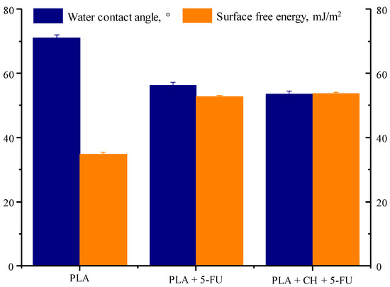 PLA is a hydrophobic polymer with a typical contact angle of up to 85°, depending on the measurement conditions and surface roughness [26]. In the present case, this value is slightly above 70°, which is in good correspondence with other authors’ findings. Because of its poor wetting capabilities, its surface energy is generally considered to be moderate to low. Suitable values for these parameters in terms of proper adhesion and wettability are well below 90° for the contact angle and above 27 mJ/m2 for the surface free energy, based on the value of the skin’s crucial surface tension [27]. Pure PLA film has values close to those mentioned above, but they can still be considered rather poor. After the addition of 5-FU, which is slightly hydrophilic, and due to the formation of voids on the film surface, as observed in the microscopic images, the wettability was improved. The contact angle was around 57°, and the surface free energy was slightly below 57 mJ/m2. The inclusion of chitosan particles further reduced the contact angle to 53° due to its hydrophilic behaviour and ability to bind with water. As a result of this, the surface free energy value approached 54 mJ/m2. Therefore, the obtained structures exhibited improved wettability and suitable parameters for skin application.