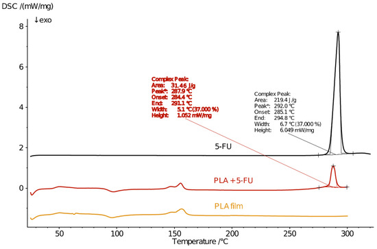 Thermograms of 5-FU (black line), PLA film loaded with 5-FU-chitosan particles (red line), and PLA film loaded with empty chitosan particles (yellow line).