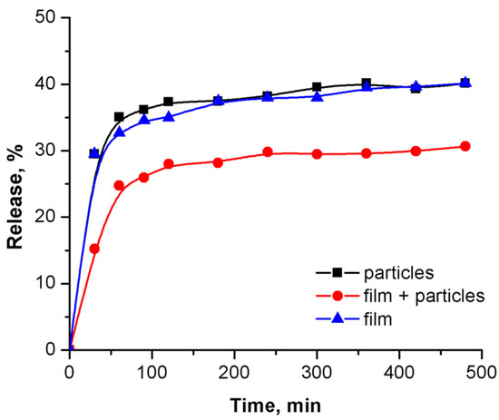 To confirm the potential of a given structure as a cargo system, its ability to entrap and prolong the release of the active compound of choice should be examined and evaluated. To do this, the release profiles of each prepared sample were tested under conditions that simulated the administration route and spot as closely as possible. Figure 8 shows the 5-FU release profiles from chitosan particles, PLA film, and PLA film with embedded particles.