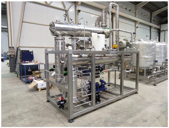 In any MVC system, two of its components can be considered critical to understanding how the desalination process works: the compressor and the evaporator. The compressor is the device responsible for generating the operating conditions, while the evaporator is responsible for generating the distillate according to the conditions delivered by the compressor. Other components necessary for warranting energy efficiency of this thermal process are heat exchangers operating as pre-heaters and recirculating pumps for avoiding fouling inside the system. MVC desalination systems also contain an external source of heat, responsible for generating the initial steam needed by the compressor to start its operation and in times of lower steam production. The external source of heat can be found as an electric boiler, like in the case of the LIFE-Desirows project [25] and shown in Figure 1 or like thermal solar collectors as presented by Kalogirou [32]. More information about MVC technology and its configurations can be found in a recent review from Shamet [8].