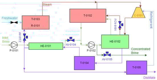 The validation of the model was achieved using information from a real MVC experimental facility in Campo de Cartagena (Spain), part of the LIFE-Desirows demonstration project [25] focused on ZLD from desalination plants [5]. This MVC prototype is a small-scale plant, as seen in Figure 1, and it is analysed under steady-state conditions. Figure 2 shows a simplified flow diagram of the real experimental plant that highlights its key components: (i) an additional heat source (T-0103 + R-0101), (ii) evaporator with flash tank (HE-0102 + T-0102), (iii) compressor (C-0101), and (iv) preheater (HE-0101) and (v) automatic valves (AV-0104, AV-0105, FCV-0101, etc.). The functions of each specific element of the MVC system are listed in Table 1.