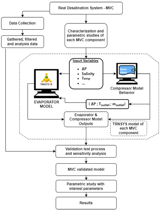 This contribution proposes a feasible model of an MVC system with TRNSYS software [26], considering constraints observed from a real life experimental plant and validating the model with real measured values from that same tested MVC experimental facility [31]. Parametric studies can be generated in this model with different operating conditions, estimating which variable affects the most to the final outcome of the system, but this contribution focuses on its validation only. The methodology followed is shown schematically in Figure 3. The process starts by understanding the relationships between the components of the real MVC plant, including their mass and energy balances, and determining the availability of the necessary variables for these balances. After that, data from the MVC experimental plant in operation are gathered, selected and filtered. This data will be used to validate and verify the reliability of the model created. In parallel, each element in the MVC desalination system is independently characterized, calculated and connected to create a model in Section 4.1. The proposed model is based on the combined calculation of the two main components of the MVC: the compressor and the evaporator. These components’ models are explained in the following Section 4.2 and Section 4.3.