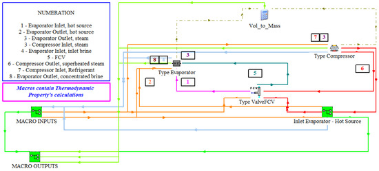 For this contribution, a model that contains each element of the MVC system is created using TRNSYS, and the outcomes generated are compared with the real experimental results from the facility to validate the model. The model’s accuracy is validated using three real operating condition datasets corresponding to various days of experimental plant operation. Figure 4 shows the schematic of the model developed in TRNSYS for the complete MVC system. The authors have created the evaporator, valve FCV, and compressor without considering TRNSYS libraries. As validation is the ultimate goal of this model, and the real plant has no record of variables between the outlet of the main heat exchanger and the inlet of the flash tank, the evaporator is analysed as a block of these two elements where the mass and energy balance are equivalent under ideal conditions. In this model, secondary elements available in the libraries such as pipes or vent valves have been omitted.