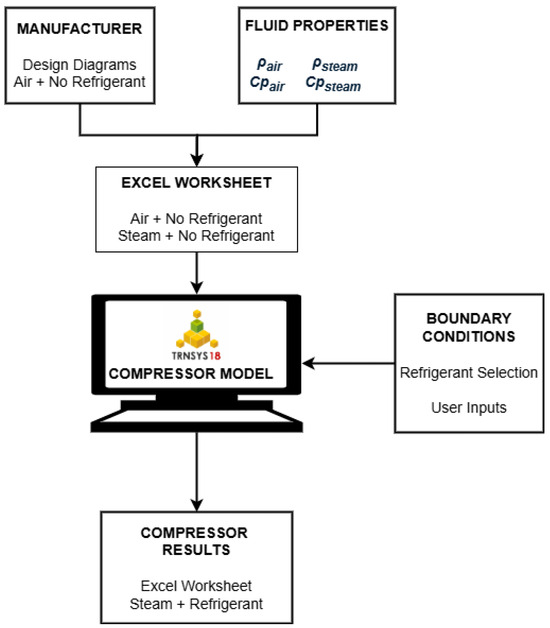 The modelled compressor represents a digital version of a compressor, considering as input variables the ones that can be modified by plant operators of MVC systems. These variables are selected using the expertise achieved in the experimental plant from LIFE Desirows [25]. The developed model converts the information provided by compressor manufacturers into valid values for TRNSYS to reproduce the behaviour of the compressor under working conditions in the MVC system. The steps followed in the modelling process of the compressor are described in Figure 5, where a manufacturer provides the design diagrams of the compressor tested with air as the working fluid.