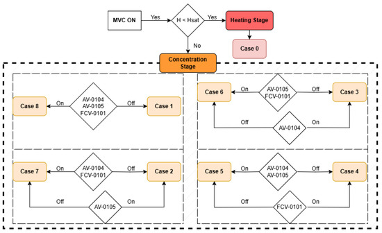 The MVC model and its evaporator are validated with the data registered at the LIFE Desirows’ MVC facility [31]. In these two stages, heating and concentration, different situations can occur depending on both the evaporation process’s time interval and the sensors signals reaching the evaporator. Each situation is called a ‘case’, and each case uses the continuity equations with different input values depending on their incoming and outgoing streams. Each ‘case’ depends on the opening and closing of each of the valves connected to the evaporator, but especially of the relative time within each cycle. This opening and closing of valves generates different situations in the mass and energy balance, reinforcing the importance of a correct definition of each ‘case’. Figure 6 shows a graphical diagram of the steps followed for selecting each ‘case’.