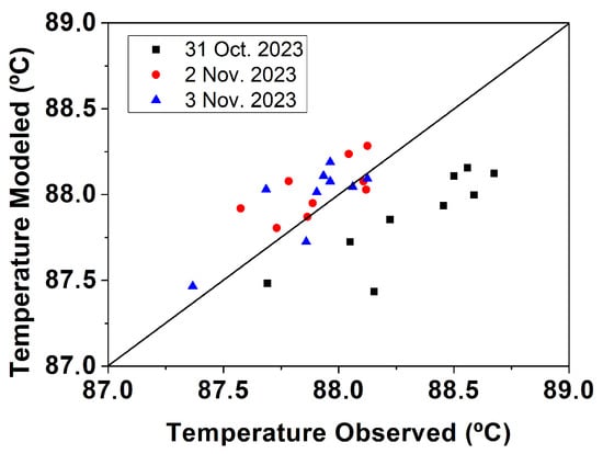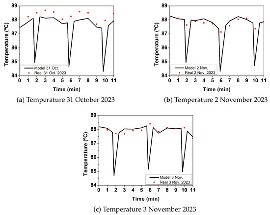 A total of 12 temperatures are compared on each typical day during the concentration phase. The results of three of these simulations for different days can be seen in Figure 7. The figure shows how the modelled temperatures closely match the actual temperatures recorded every minute, over 12 min, at the experimental plant with the TT-0103 sensor, using the registered PT-0101 pressure as input value. The model is able to reproduce the temperature drops due to the opening of AV-0104, allowing new brine to enter the evaporator every 4 min. These temperature changes are not observed in the values recorded at the actual facility since the temperature achieved by the preheater is almost the same as the one inside the evaporator. Moreover, real measurements are spaced 1 min apart, which also limits the observation of instantaneous valve opening and closing effects accurately. Analysing the effect of the cold brine and comparing it with the actual measurements demonstrates the validity of the internal equations considered in all evaporator cases. The reliability of the model is also observed by analysing the dispersion of the evaporator temperature values. For the three days studied, in the scatter of these values in Figure 8, it can be observed that the deviation from the model results is very slight, which reinforces the model reliability considering only sensors that contribute to the energy balance of the system are available in the experimental facility. Since the experimental facility lacks flow meters, instant mass balances are approached from a global amount of distillate produced and brine consumed, the main factor contributing to an of to be considered as reliable for a physical model.