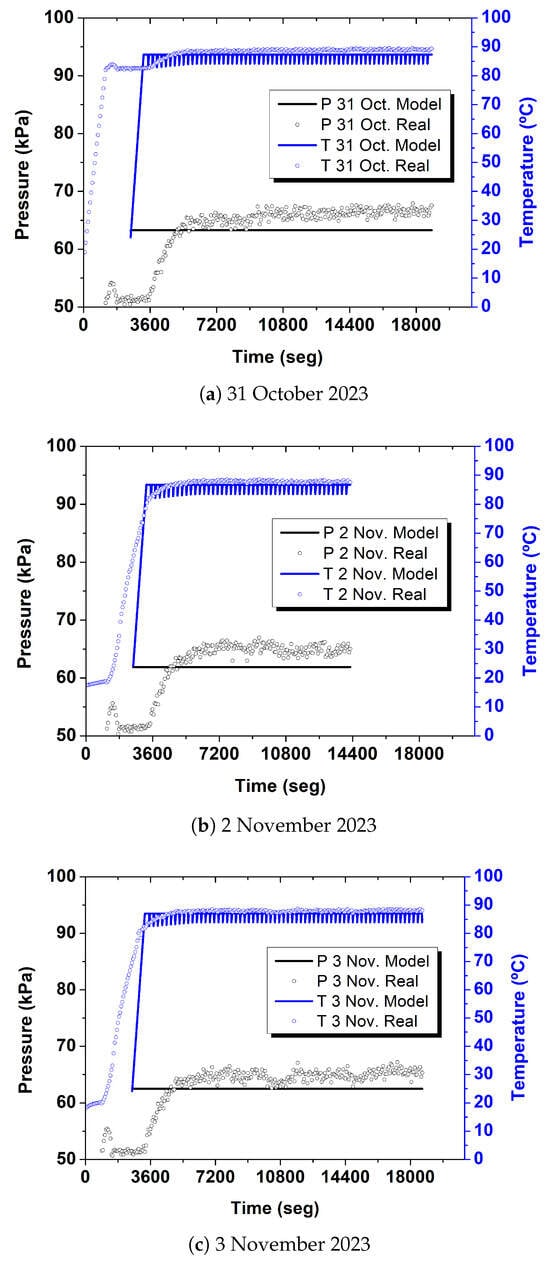 The comparison also shows that the model reaches the concentration conditions much sooner than in reality because the losses due to warming the environment have not been taken into account, nor the thermal inertia of the elements of the system. Therefore, the same times and cycles of the concentration stage have been used to calculate the concentrated and distilled mass produced, shown in Table 7.
