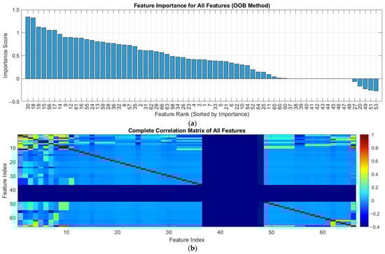 In this study, feature importance was calculated using the Out-of-Bag (OOB) Permuted Predictor Importance method, a robust technique for evaluating feature contributions to predictive performance [30,31]. One key advantage of random forests is their ability to estimate predictor importance through permutation of OOB observations across the ensemble of trees [30,31,32,33]. This approach was selected because it provides reliable importance measures while maintaining the model’s predictive accuracy and handling high-dimensional data effectively. This study also analyzes feature selection based on correlation matrices.