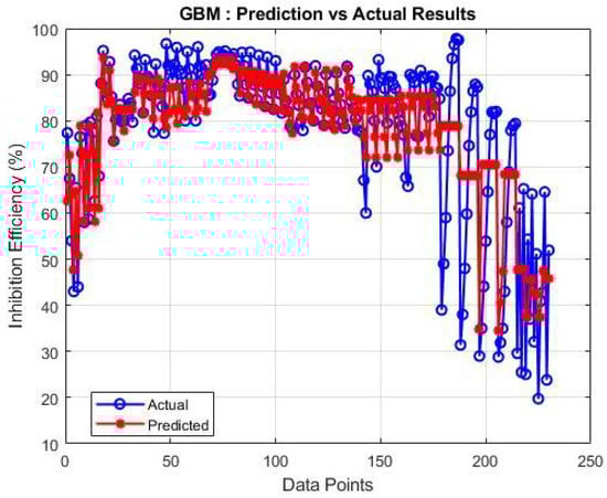 Figure 2 presents the prediction results of the GBM algorithm for mineral scale inhibitor efficiency. The model achieved an R2 value of 0.7062, indicating moderate predictive capability. This performance level likely stems from GBM’s ability to handle complex, non-linear relationships between inhibitor dosage and scaling ions. However, the relatively lower R2 compared to other algorithms suggests limitations in capturing subtle interactions between certain ion pairs, particularly at extreme temperature ranges (above 90 °C) where inhibitor performance becomes highly non-linear.