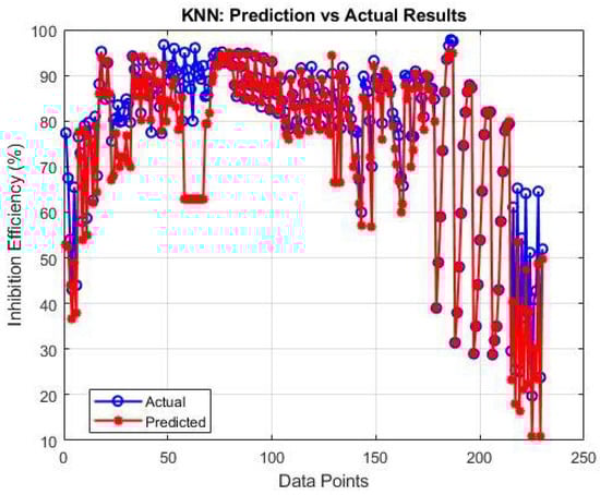 In Figure 3, the performance of the KNN algorithm using the collected database is shown. In Figure 3, the KNN algorithm demonstrates improved performance with an R2 of 0.7731. The better accuracy can be attributed to KNN’s local approximation approach. The remaining prediction errors may occur in samples with unique ion combinations that lack close neighbors in the training set, highlighting a fundamental limitation of distance-based methods in high-dimensional spaces (66 features in this case).