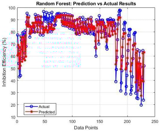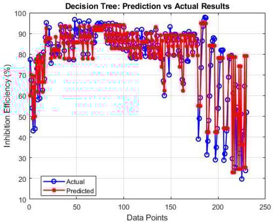 The decision tree algorithm’s performance and quality were also examined to evaluate mineral scale inhibitor efficiency under various ionic and temperature conditions. The decision tree algorithm, shown in Figure 4, achieved a strong R2 of 0.8605. This performance reflects the algorithm’s ability to identify critical thresholds in the data, particularly the important interactions between calcium concentration and temperature (>70 °C) that dominate scaling behavior. The slight underestimation of inhibitor efficiency at high dosage levels suggests the tree depth might have been limited to prevent overfitting.