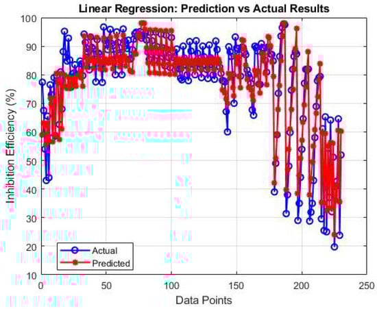 Linear regression, as one of the fundamental machine learning regression methods, was used to predict mineral scale inhibitor efficiency in oilfield systems. As shown in Figure 6, linear regression achieved a surprisingly high R2 of 0.8981. This strong performance suggests that many inhibitor–ion interactions follow approximately linear trends within the concentration ranges studied.