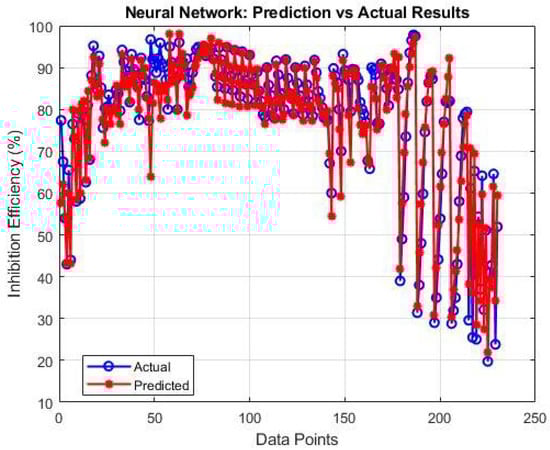 Given the special importance and wide application of neural networks in chemical systems, this study also employed this method to evaluate mineral scale inhibitor performance in the presence of formation/injection water ions and various inhibitor dosages. The results are presented in Figure 7. The neural network results in Figure 7 show the best performance so far (R2 = 0.9230). The network’s ability to model complex, higher-order interactions between multiple ions and temperature accounts for this improvement.