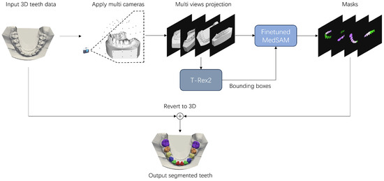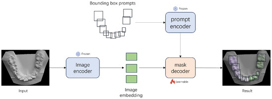 SAM, with its powerful zero-shot segmentation capabilities, provides a pre-trained segmentation tool for numerous applications. Consequently, research on fine-tuning and lightweighting SAM has recently become a hot topic. Zhang et al. [18] propose a one-shot variant called PerSAM, building on SAM’s zero-shot capabilities. PerSAM extracts features from a specified input image and mask, then uses these features in subsequent image segmentation to generate foreground and background prompts, guiding the segmentation of specific targets. Zhao et al. [19] improve the segmentation efficiency of the SAM model from the perspective of reducing the computational overhead. In order to improve the efficiency of segmentation, the segmentation process is decoupled into the following two tasks: detecting object bounding boxes for all objects in the image and performing object segmentation according to these bounding boxes. The original ViT encoder structure of SAM is replaced by using the YOLOv8-seg backbone. Their framework reduces the amount of data required for SAM training and inference time. To create a lightweight deep learning network, Zhang et al. [20] apply knowledge distillation to substitute SAM’s image encoder with Tiny-ViT, significantly reducing the parameter count and enhancing inference speed. Ma et al. [21] adapt SAM specifically for medical image segmentation, fine-tuning SAM’s mask decoder and reducing input prompts to only bounding boxes. This method gives high accuracy and reliability in various medical imaging tests. Similarly, Wu et al. [22] adapt SAM for medical applications without training, instead of using lightweight adapters to fine-tune pre-trained SAM for the medical image segmentation task. Zhang et al. [23] focus on fine-tuning SAM by freezing the image encoder and using LoRA to adapt encoders for medical images. The same strategy is adopted for the decoder, with LoRA being utilized for fine-tuning. Inspired by the aforementioned work, we fine-tune the pre-trained model (SAM) on our own dataset to adapt to our tooth segmentation task. We only use bounding boxes as the input prompt. Ref. [24] shares a similar idea to ours; however, our method solely utilizes SAM for 2D segmentation, without integrating features from both 2D images and 3D point clouds as in their approach.