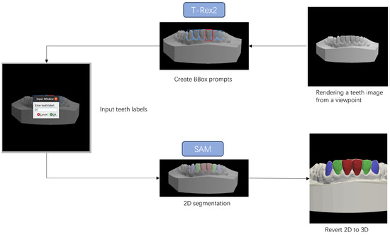 Tooth segmentation process based on bounding box prompts. By performing a few selections on the 2D tooth images using T-Rex2, bounding boxes for most teeth can be obtained. Subsequently, the segmented pixels from MedSAM can be mapped back to the 3D mesh to complete the tooth segmentation.
