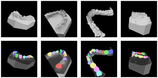 Specifically, 3D tooth data from the MICCAI2022 Challenge public dataset 3DTeethSeg22 was used as the fine-tuning dataset (600 pairs of upper and lower teeth, totaling 16,004 teeth) and the test data (300 pairs of upper and lower teeth, totaling 7995 teeth). The MedSAM mask decoder was trained using projected 2D images, all 73 views, with an image resolution of , resulting in a total of 131,400 teeth images, namely 2D-TeethSeg, of which 87,600 were used as training images and 43,800 as test images, as shown in Table 1.