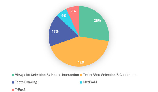 Breakdown of our tooth segmentation time. Teeth BBox selection and annotation accounts for the largest share (42%), followed by the viewpoint selection by mouse interactions (28%) and teeth drawing (17%). T-Rex2 (7%) and MedSAM (6%) represent smaller shares; their inclusion demonstrates the integration of automated tools, contributing to improved annotation efficiency and accuracy.