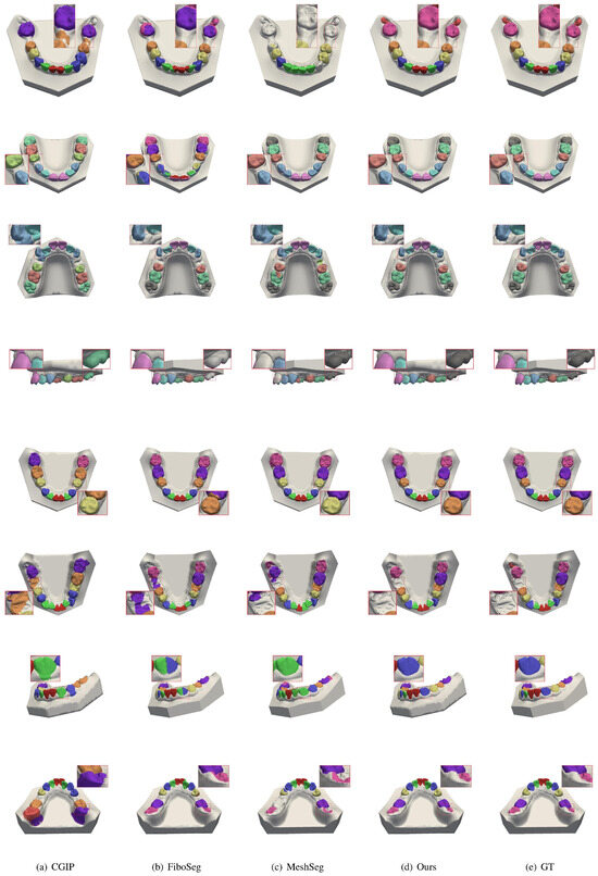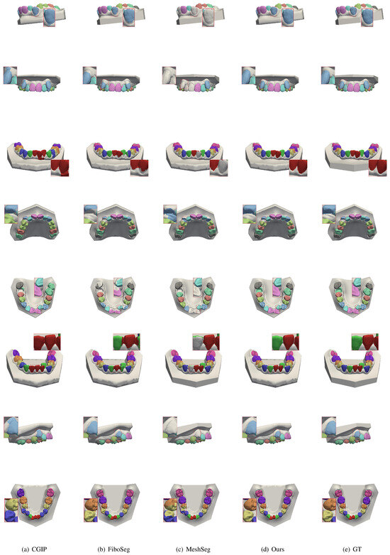 In order to further verify the segmentation results in the case of incomplete jaws, some teeth were cropped and tested in this study, and the results are shown in Figure 8. In the case of incomplete jaws, the segmentation accuracy of most of the methods is greatly reduced, and in some cases, segmentation cannot be performed at all. However, our method can effectively overcome the challenges posed by jaw incompleteness, providing more accurate segmentation. It demonstrates strong generalization and offers greater flexibility for practical use by dentists. More segmentation comparison results are provided, including missing teeth, misaligned teeth, and incomplete jaws, as shown in Figure 9, Figure 10 and Figure 11.